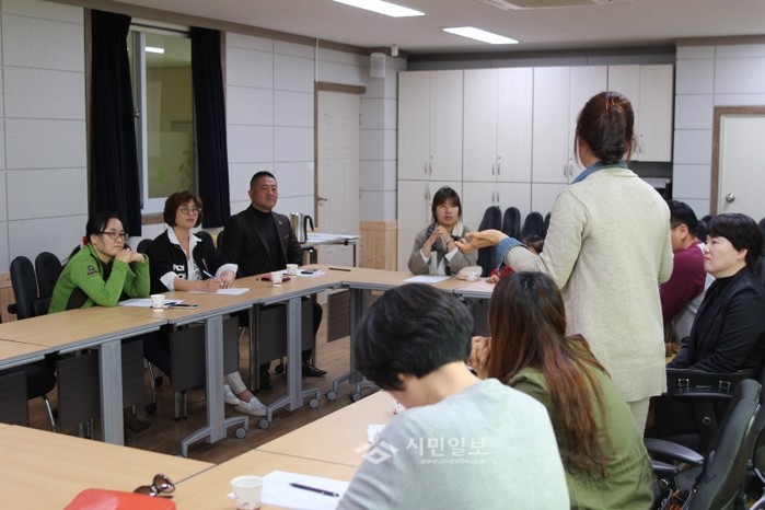 지난 8일 충남 아산교육지원청은 특수교육지원센터 2층 연수실에서 2016 행복나눔기자단 사전협의회를 실시했다. 사진은 협의회에 참석한 관계자들이 이야기를 나누는 모습.(사진제공=아산교육지원청)