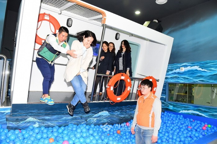 최근 인천시 부평구는 일상생활을 위협하는 다양한 재난·재해 등 안전사고에 사전 대응 능력을 키우고 실생활에서 안전의식을 높이기 위해 부평안전체험관에서 소속 공무원을 대상으로 ‘안전체험교육’을 실시했다. 사진은 교육 참가자들이 해상 탈출 훈련을 진행하는 모습.(사진제공=부평구청)