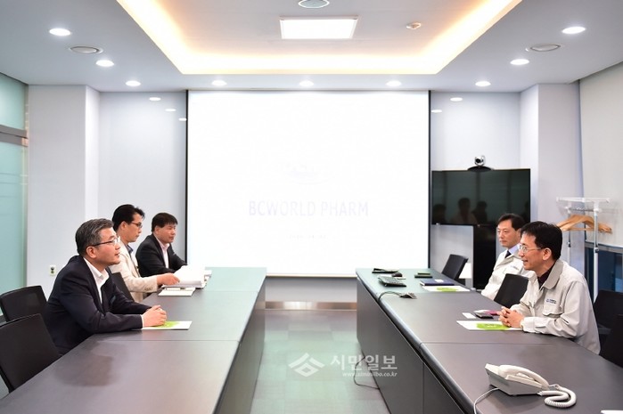 최근 경기 여주시는 원경희 여주시장을 비롯한 시 관계공무원들은 가남읍 소재 (주)비씨월드제약을 방문해 기업현황과 애로 및 건의사항 등을 청취했다. 사진은 원경희 시장(왼쪽)과 관계자들이 이야기를 나누는 모습.(사진제공=여주시청)