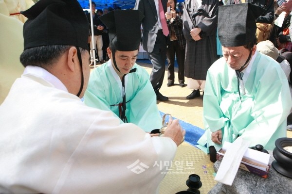 최근 이해식 강동구청장은 남양주시 다산유적지 묘역에서 열린 '다산 선생 서세 180주기 묘제'에 마지막 잔을 올리는 종헌관(終獻官)을 맡아 제례를 진행했다. 사진은 이 구청장(가운데)이 술잔을 받고 있는 모습.(사진제공=강동구청)