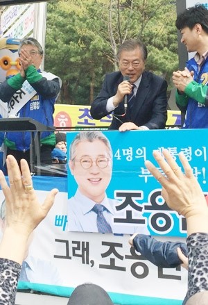 [=연합뉴스 기자]10일 오전 경기도 남양주시 평내호평역 인근에서 더불어민주당 문재인 전 대표의 유세를 지켜본 지지자가 만세를 하고 있다.