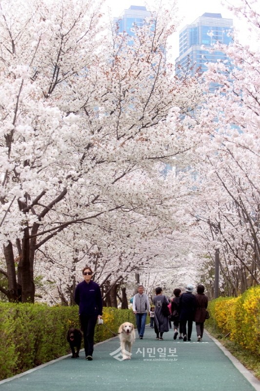 도심속 생태하천으로 각광받고 있는 서울 강남구 양재천 양안(영동2교부터 탄천2교) 3.7km 구간에 최근 벚꽃이 만개해 절정을 이루고 있다. 사진은 양재천을 찾은 시민들이 산책을 즐기는 모습.(사진제공=강남구청)