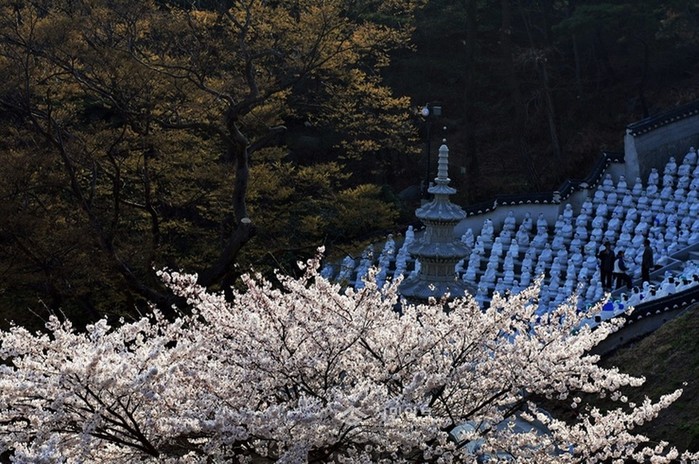 | ▲ 인천 석모도 보문사의 마애관음 보살상이 내려다보이는 낙가산에 벚꽃나무가 만개해 아름다운 풍경을 만들어내고 있다. | ||