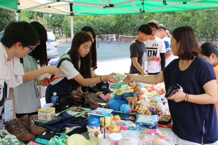 지난 9일 경기 (사)동두천시종합자원봉사센터가 주관하는 '청소년 사랑나누미 녹색가게'가 신시가지 차 없는 거리에서 열렸다. 사진은 녹색가게를 방문한 시민이 물품을 구입하는 모습.(사진제공=동두천시청)