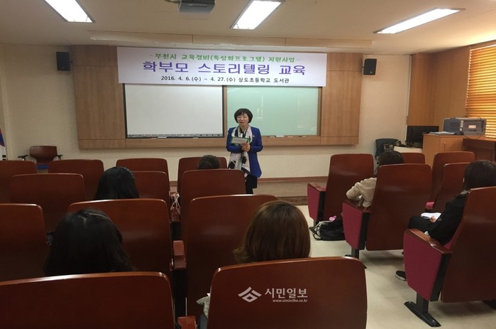 최근 경기 부천 상도초등학교는 학부모 스토리텔링 교육을 진행했다. 사진은 교육에 참석한 강사가 학부모들에게 스토리텔링의 원리에 대해 설명하는 모습.(사진제공=부천교육지원청)