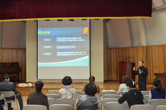 지난 12일 강남소방서는 5층 강당에서 다중이용업소 관계자 20여명을 대상으로 '소방안전교육'을 실시했다. 사진은 소방서 관계자가 화재안전 관리에 대한 강의를 진행하는 모습.(사진제공=강남소방서)