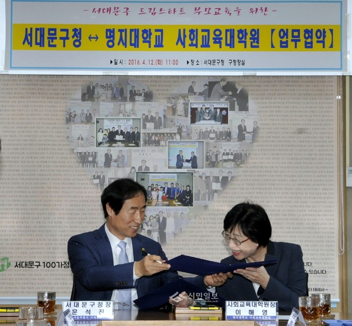 지난 12일 서대문구는 명지대학교 사회교육대학원과 드림스타트 부모에게 미술치료 교육을 진행하는 '드림스타트 부모교육을 위한 업무협약'을 맺었다. 사진은 문석진 구청장(왼쪽)과 이해영 명지대 사회교육대학원장이 협약서를 교환하는 모습.(사진제공=서대문구청)