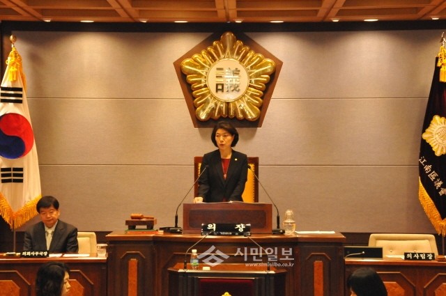 | ▲ 지난 제246회 강남구의회 임시회에서 김명옥 의장이 개회사를 하고 있다.(사진제공=강남구의회) | ||