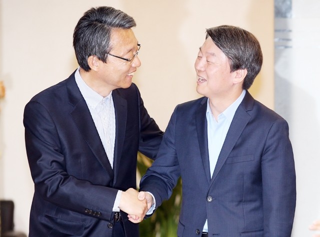 국민의당 안철수 대표가 14일 오전 당사로 출근하며 관악구갑 김성식 당선인과 인사하며 활짝 웃고 있다. 국민의당은 전날 치러진 20대 총선에서 39석을 얻으며 신생정당으로는 대약진했다.