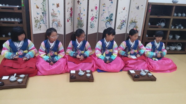최근 경북 구미시 송정초등학교는 구미 글로벌 예절 체험관에서 4학년 학생들을 대상으로 '글로벌 예절 체험 학습'을 실시했다. 사진은 행사에 참석한 학생들이 다도 체험을 하는 모습.(사진제공=구미교육지원청)