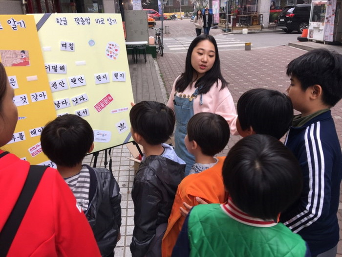 최근 경기 김포시청소년육성재단에서는 '바른 말 고운 말 이상한 말'의 주제로 사우청소년문화의집 청소년운영위원회 20명과 청소년지도사가 함께 상반기 청소년 유해환경정화활동 캠페인을 실시했다. 사진은 행사 참가자가 한글 맞춤법에 대해 설명하는 모습.(사진제공=김포시청)