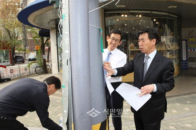 | 박문수 의원(오른쪽)이 전신주에 설치된 부착방지시트에 직접 광고물을 부착해보며 효과 등을 점검하고 있다.(사진제공=강북구의회) | ||