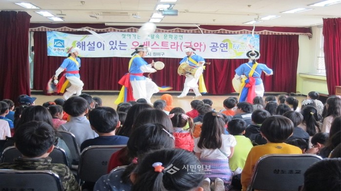 14일 경기 부천시 상도초등학교 다목적실에서 해설이 있는 국악 공연이 열렸다. 사진은 행사에 참석한 관계자들이 사물놀이를 하는 모습.(사진제공=부천교육지원청)