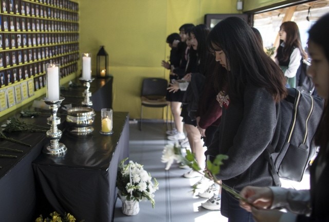 4.16세월호 참사 2주기를 하루 앞둔 15일 오후 서울 광화문 광장 세월호 분향소에서 학생들이 헌화 후 묵념을 하고 있다.