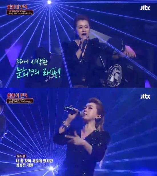 문희경은 지난 15일 방송된 '힙합의 민족'에서 MC 스나이퍼와 같이 '무인도' 무대를 선보이며 '스웩' 넘치는 무대 퍼포먼스와 나이를 잊게 만드는 랩 실력을 공개해 관객과 시청자들의 폭발적인 호응을 받았다.