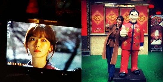 사진 속 그는 카메라 앞에서 연기를 펼치고 있는가 하면, 함께 출연하는 김영철을 닮은 동상과 함께 '엄지 척' 포즈를 취하고 있다.