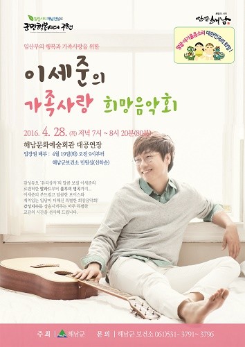 해남군은 오는 28일 해남문화예술회관 대공연장에서 유리상자 이세준씨를 초청 ‘가족사랑희망음악회’를 개최한다.
