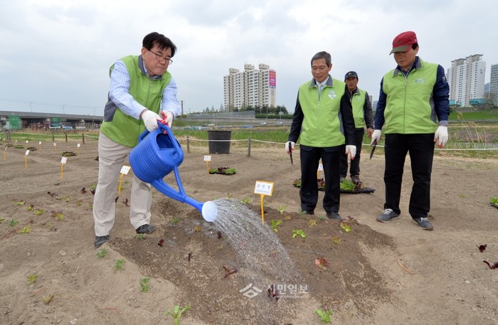 지난 16일 서울 동대문구는 중랑천 제3체육공원(겸재교 하단)에서 중랑천 도시농업 체험학습장 개장식을 개최했다. 사진은 개장식에 참석한 유덕열 구청장(왼쪽)이 모종을 심고 텃밭에 물을 주는 모습.(사진제공=동대문구청)