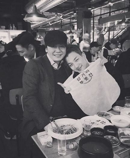 공개된 사진 속 태양은 양현석의 어깨에 기대 미소를 지으며 카메라를 응시하고 있다.