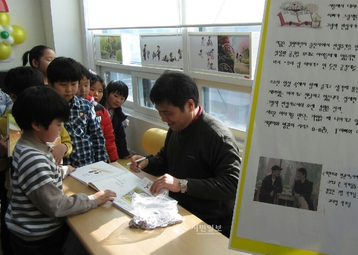 최근 서울 구로구는 도서관 주간(4월12~18일)을 맞아 지역내 도서관에서 '작가와의 만남' 행사를 개최했다. 사진은 개봉어린이도서관에 그림책 <손톱 깨물기>, <아빠와 아들> 등을 집필한 고대영 작가가 방문해 그림책이 만들어지는 과정을 설명하는 모습.(사진제공=구로구청)