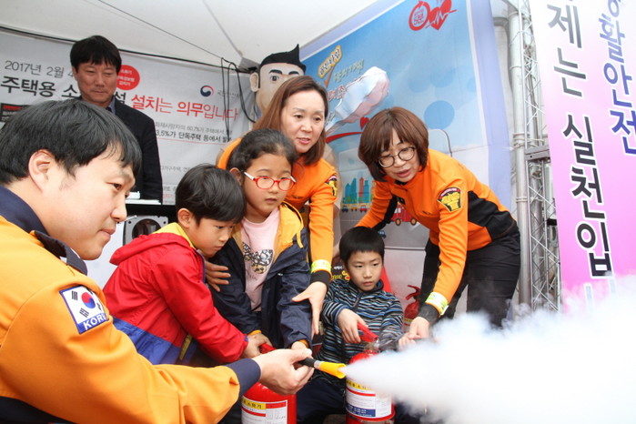 지난 16~17일 서울 동작소방서는 제2회 국민안전의 날을 맞아 보라매공원내 '찾아가는 안전체험교실'을 운영했다. 사진은 지난 16일 어린이들이 소화기 사용 실습을 하는 모습.(사진제공=동작소방서)