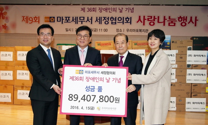 최근 박홍섭 서울 마포구청장은 제36회 장애인의 날을 맞이해 마포세무서 세정협의회가 우리마포복지관에서 개최한 '마포세무서 세정협의회 사랑나눔행사'에 참석했다. 사진은 박홍섭 구청장(오른쪽에서 두번째)이 관계자들과 기념촬영을 하는 모습.(사진제공=마포구청)