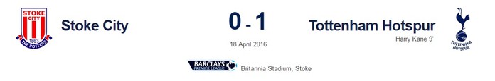 토트넘 홋스퍼는 19일 오전 4시(한국시간) 잉글랜드 스토크 온 트렌트에 위치한 브리타니아 스타디움에서 열리고 있는 2015-2016 잉글리시 프리미어리그 스토크시티와의 34라운드 원정경기에서 후반 19분 현재 1-0으로 리드하고있다.