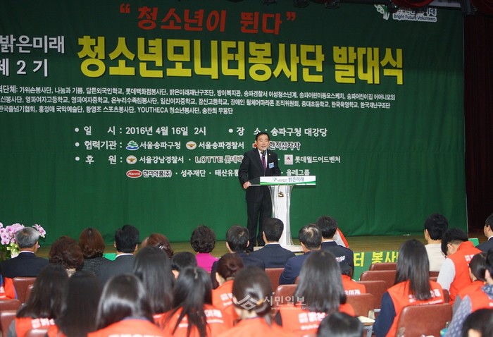최근 임춘대 서울 송파구의장은 구청 대강당에서 사단법인 ‘밝은미래’에서 봉사활동에 참여하고자 하는 지역내 중·고등학생 200여명으로 구성된 청소년 봉사단체인 '청소년 모니터봉사단'의 제2기 발대식에 참석했다. (사진제공=송파구의회)