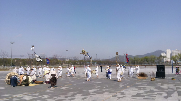 지난 17일 인천 서구는 인천아시안게임 주경기장 북측광장에서 쑥대고잔 지경다지기 공연을 개최했다. 쑥대고잔 지경다지기는 인천의 경서동, 오류동, 반월촌 등지의 바닷가 지역에서 마을사람들이 함께 모여 집을 짓기 전 집터다지기를 할 때 부르던 노동요다.(사진제공=인천 서구청)