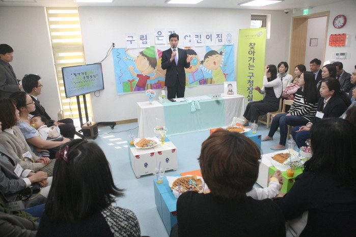 지난 18일 이해식 서울 강동구청장은 지역내 새로 개설된 구립 은강어린이집에서 구 관계자와 보육아동 부모 20명, 보육교사 4명 등 총 36명이 참석한 가운데 ‘제139차 찾아가는 구청장실’ 행사를 실시했다. 사진은 이해식 구청장이 발언하는 모습.(사진제공=강동구청)