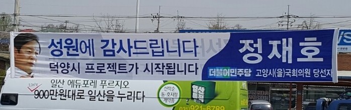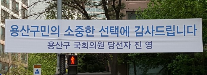현수막에 '더불어민주당' 표기를 한 경기 고양시을 정재호 당선자에 반해 당 표기가 돼 있지 않은 서울 용산 더민주 진영 당선자의 현수막이 눈에 띈다.