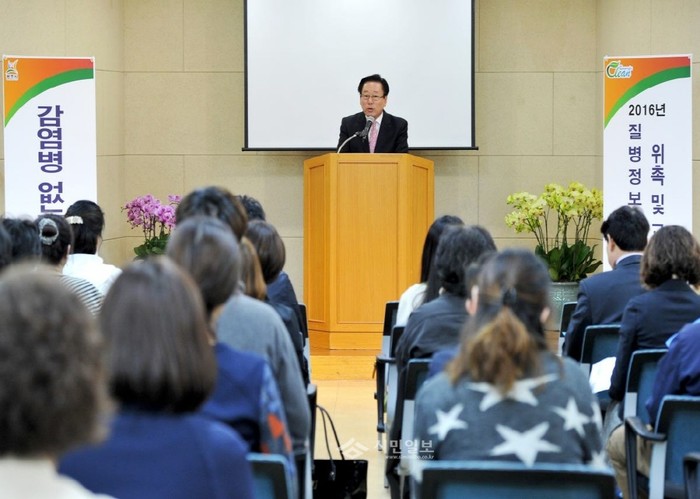 지난 19일 경기 광주시는 보건소 회의실에서 질병정보모니터요원 등 보건관계자 200여명이 참석한 가운데 '2016년 질병정보모니터 요원 위촉식'을 개최했다. 사진은 조억동 시장이 위촉식에서 축사하는 모습.(사진제공=광주시청)