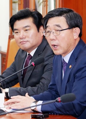 이기권 고용노동부 장관이 20일 오전 국회 새누리당 원내대표실에서 원유철 원내대표를 만나 파견법을 비롯한 노동개혁 4법의 입법과 관련해 설명하고 있다.