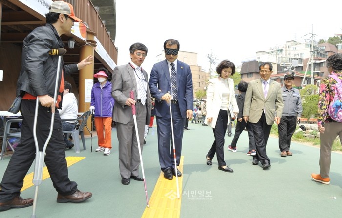 지난 20일 서대문구는 '제36회 장애인의 날'을 맞아 홍제천 폭포마당에서 ‘2016년 장애인 한가족 한마당’ 행사를 개최했다. 사진은 문석진 구청장(왼쪽에서 세 번째)이 눈가리개를 하고 시각장애 체험을 하는 모습.(사진제공=서대문구청)