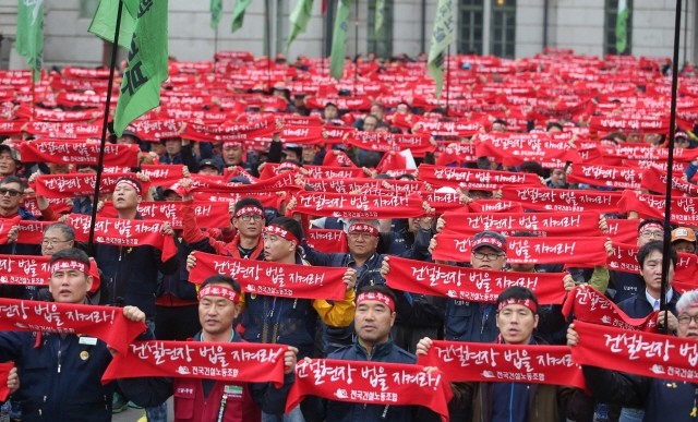 민주노총 전국건설노동조합 소속 조합원들이 21일 서울 중구 서울역광장에서 열린 '건설노조 확대간부 및 열성조합원 투쟁 결의대회'에서 '건설현장 법을 지켜라!'라고 적힌 수건을 펼쳐들고 구호를 외치고 있다.
