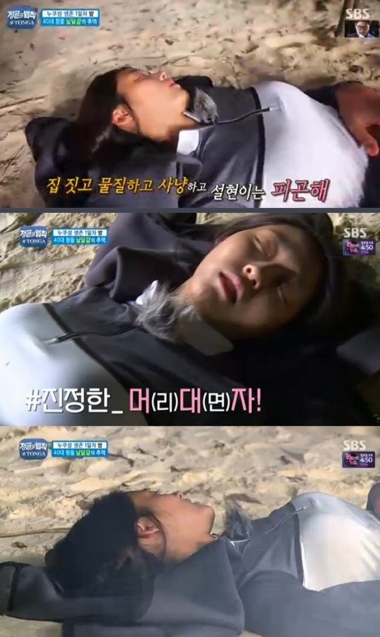 이에 지난 15일 방송 또한 재조명됐다. 당시 방송에서 그는 밤 사냥을 다녀온 후 바닥에 머리를 대자마자 금새 단잠에 빠졌다. 이날 설현은 집 짓기, 물질하기, 사냥하기 등을 한 후라 더욱 피곤이 쌓였던 것.