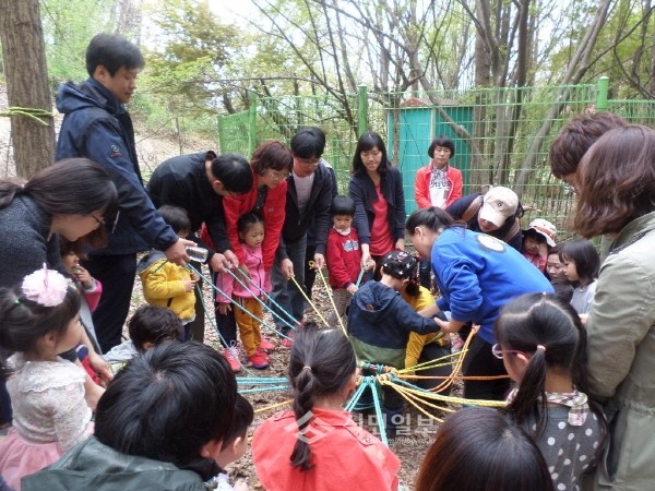 최근 경기 오산시육아종합지원센터는 지역내 어린이집 보육 교직원 및 영유아 가족을 대상으로 다양한 숲체험을 즐길 수 있는 ‘아이(I) 좋아! 숲 좋아!’ 숲체험 프로그램을 실시했다. 사진은 참가자들이 밧줄 햇님 만들기 놀이를 진행하는 모습.(사진제공=오산시청)