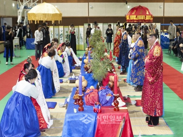 지난 21일 경북 구미시는 구미시장애인체육관에서 구미시여성단체협의회 주관으로 하객 및 내빈 등 250여명이 참석한 가운데 다문화부부 5쌍을 위한 '다문화가정 합동 전통혼례식'을 개최했다. 사진은 신랑·신부가 결혼식을 진행하는 모습.(사진제공=구미시청)