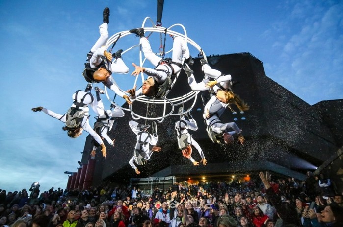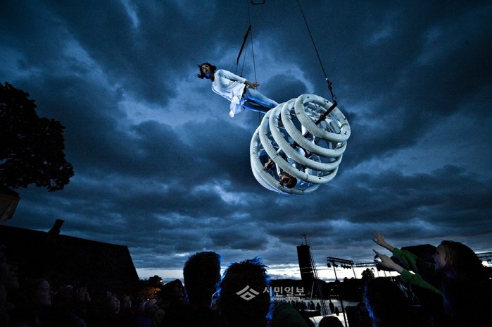 | ▲ 이번 축제 폐막작으로 예정된 '카오스모스'에서 둥근 구조물에 매달린 배우들이 하나의 유기체와 같은 퍼포먼스를 선보이고 있다. | ||