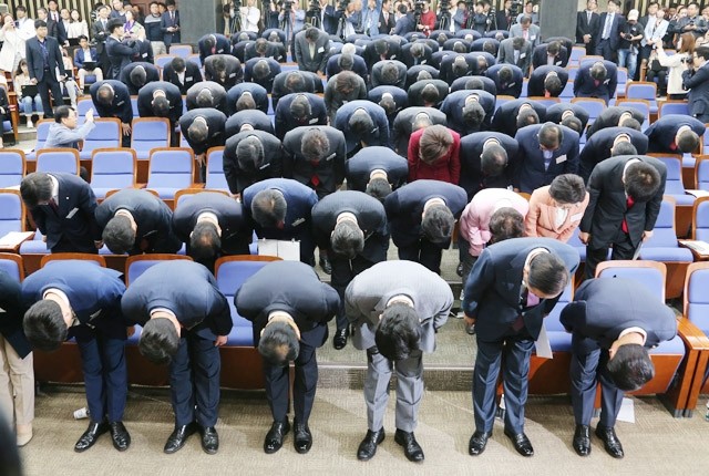 26일 오전 국회에서 열린 새누리당 제20대 국회 당선인 워크숍에서 당선인 전원이 국민에게 인사를 드리고 있다.