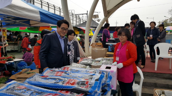 최근 경기 양평군여성단체협의회는 물맑은양평시장에서 김선교 양평군수, 군의회·도의회 의원, 각 기관단체장, 지역주민 등 600여명이 참석한 가운데 지역내 탈북민돕기를 위한 ‘사랑나눔 바자회’를 개최했다. 사진은 김선교 군수(왼쪽)가 바자회 물품을 살펴보는 모습.(사진제공=양평군청)