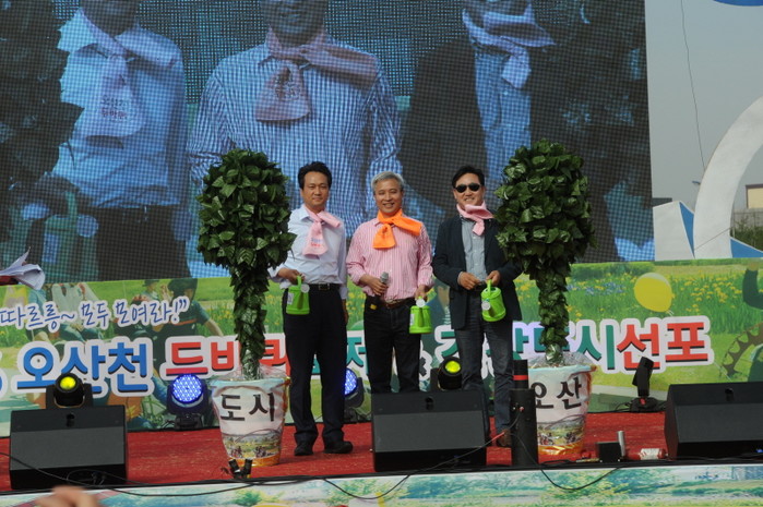 최근 경기 오산시는 오산천 일대에서 '두루 누리는 건강도시 오산'이라는 비전으로 건강도시 오산 선포식과 건강박람회를 개최했다. 사진은 곽상욱 오산시장(가운데)과 관계자들이 축하 퍼포먼스를 진행하는 모습.(사진제공=오산시청)
