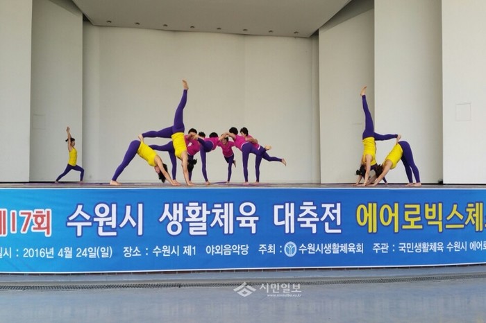최근 경기 수원시 팔달구 고등동 요가팀은 수원제1야외음악당에서 열린 '제17회 수원시 생활체육 대축전 에어로빅스체조대회'에서 금상을 받았다. 사진은 고등동 요가팀 관계자들이 에어로빅스 체조를 선보이는 모습.(사진제공=팔달구청)