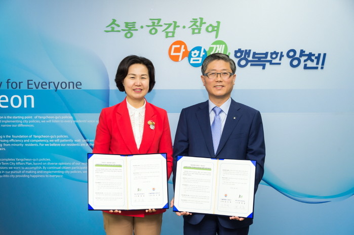 26일 오후 2시 김수영 서울 양천구청장(왼쪽)이 구청 열린참여실에서 SH공사 변창흠 사장과 지역주민의 주거복지 향상을 위한 업무협약을 체결하고 기념촬영 하고 있다.(사진제공=양천구청)