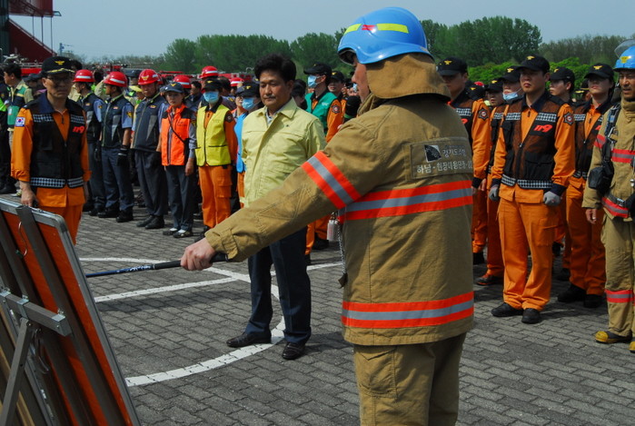 지난 26일 경기 하남소방서는 대형 재난발생시 신속한 대응태세 확립을 위해 미사동 조정경기장 관리동에서 ‘2016년 긴급구조종합훈련’을 실시했다. 사진은 이종수 하남시장 권한대행(가운데)과 소방관들이 훈련설명을 경청하는 모습.(사진제공=하남소방서)