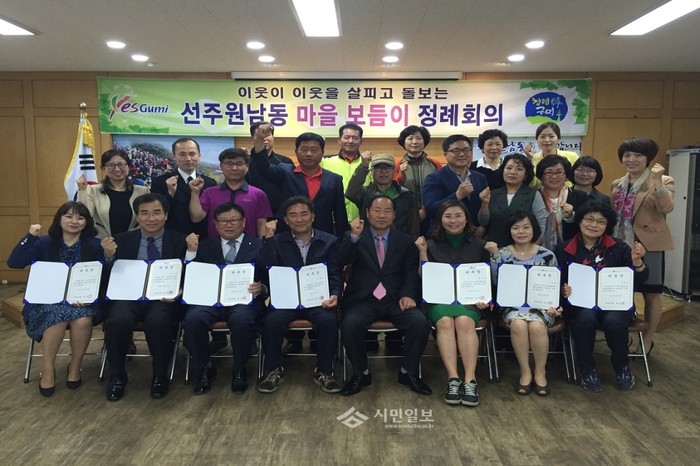 지난 26일 경북 구미시 선주원남동에서는 동주민센터 2층 회의실에서 마을보듬이 위원 30여명이 참석한 가운데 2016 복지허브화 선도지역 선정에 따른 마을보듬이 활성화를 위한 정례회의를 개최했다. 사진은 관계자들이 기념촬영을 하는 모습.(사진제공=구미시청)