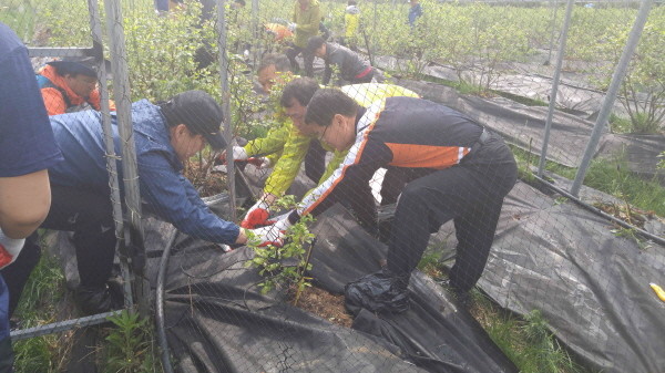 최근 경북 구미시 고아읍에서는 농림축산식품검역본부 식물검역부 직원 60여명이 참여해 농번기 일손이 부족한 지역내 농가에 대한 일손돕기를 실시했다. 사진은 직원들이 블루베리 밭에서 부직포를 설치하는 모습.(사진제공=구미시청)