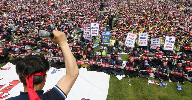 1일 오후 서울 중구 태평로 서울광장에서 열린 한국노총 5.1 전국노동자대회에서 한국노총 조합원들이 구호를 외치고 있다.