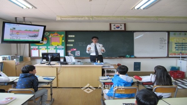 최근 경기 부천대명초등학교는 3학년 재학생들을 대상으로 교통안전교육을 실시했다. 사진은 교육을 위해 대명초등학교를 찾은 오정경찰서 관계자가 학생들에게 강의하는 모습.(사진제공=부천교육지원청)