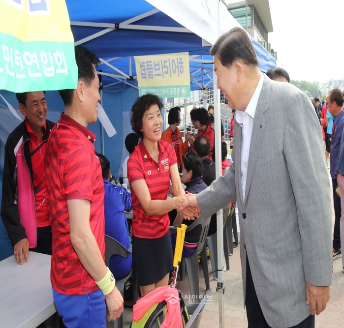조길형 영등포구청장(오른쪽)이 1일 마곡실내체육관에서 열린 '제26회 영등포구청장기 생활체육 배드민턴대회' 개회식을 찾아 참가자들과 악수하며 인사를 전하고 있다.(사진제공=영등포구청)